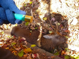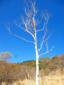 紅葉も過ぎて枯葉です 鹿の死体です。手に持っているのは薬莢です 青空に良く映えて!