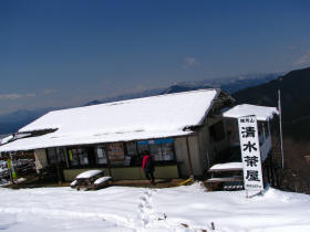 陣馬山の頂上の特徴である白馬が待っていた。一面雪景色。3月下旬だというのにこの景色。まるで雪山です。ここで思い思いの場所で昼食。頂上で或いは茶屋で、私はなめこ汁を頼んでおむすびを頬張る。なめこ汁が暖かくてうまい。