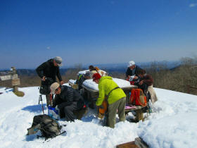 頂上の手前が階段(雪にうまっていた)で急な道を息を切らせて登ると頂上に到着。