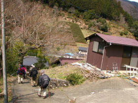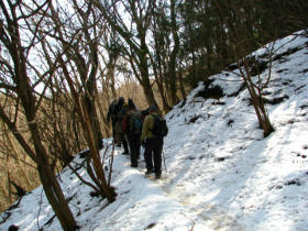 陣馬山登山口がすぐに見つかり喜んで登山道に入る。どこかかの民家の庭先を抜けて登りの急なコンクリート道を登る。ここで既に息が切れそう。上に登るに従って残雪がチラホラ見えて来て最初は軽い気持ち。徐々に残雪が道を覆い登山道は真っ白になってきた。