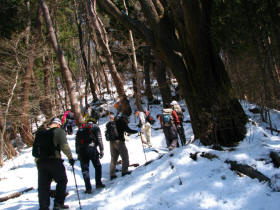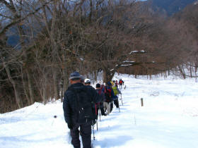 尾根道まで上がった頃は周囲も雪景色。でも天気が良いので気分は良い。徐々に雪が深くなり前の人が歩いた足跡を歩くようになる。