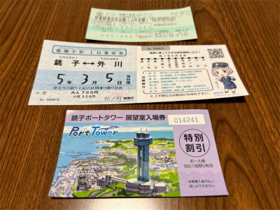 お土産購入時間が若干少なかった方もおりましたが、バスで銚子駅にもどり電車までの時間を利用して駅前でお土産追加し帰途につきました。駅の写真や利用した切符は